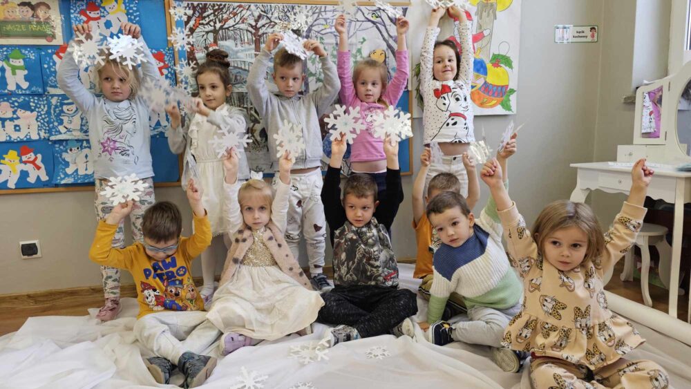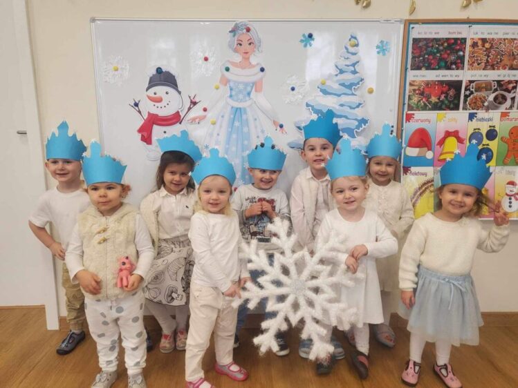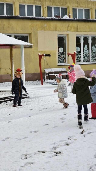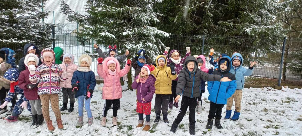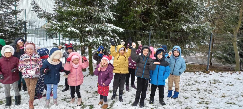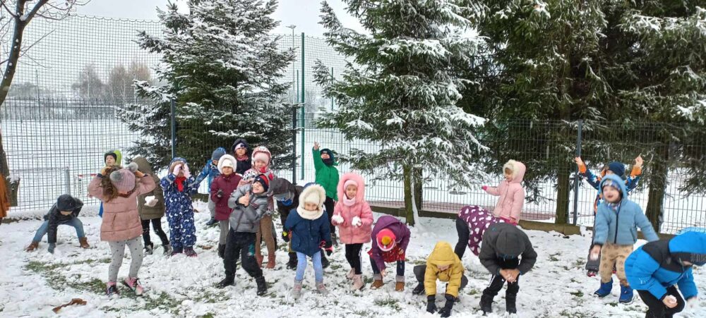 Dnia 22 grudnia w naszym przedszkolu świętowaliśmy Pierwszy Dzień Zimy. Od samego rana dzieci były bardzo podekscytowane, gdyż zima zrobiła nam miłą niespodziankę i naprószyła śniegiem. Tego dnia dzieci witały zimę na różne sposoby: brały udział w zimowych zabawach, rozwiązywały zimowe zagadki, śpiewały piosenki, wspólnie tańczyły i wykonały prace plastyczną. Na zakończenie odbył się spacer, gdzie urządziliśmy bitwę na śnieżki, a radości i uśmiechu nie było końca.