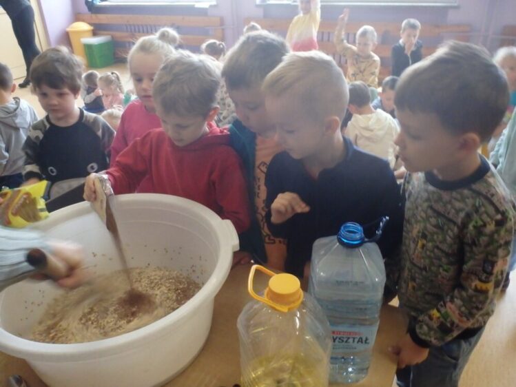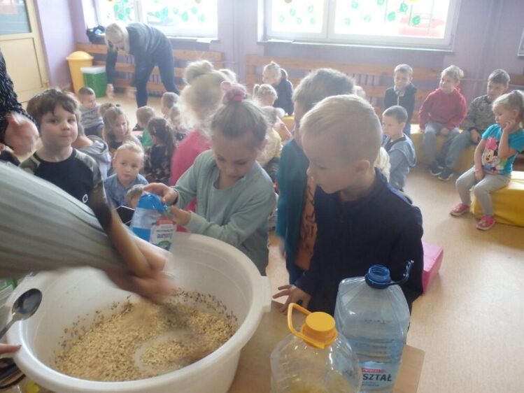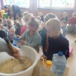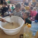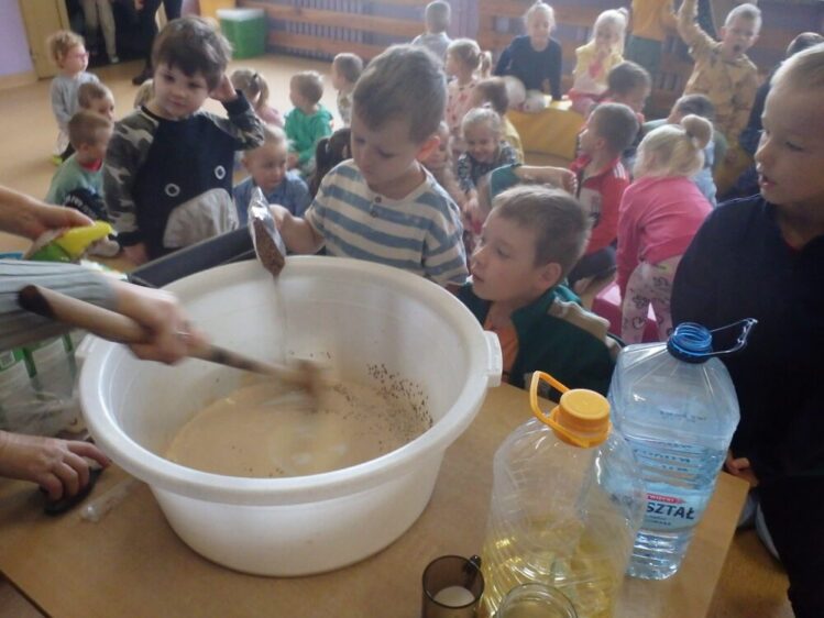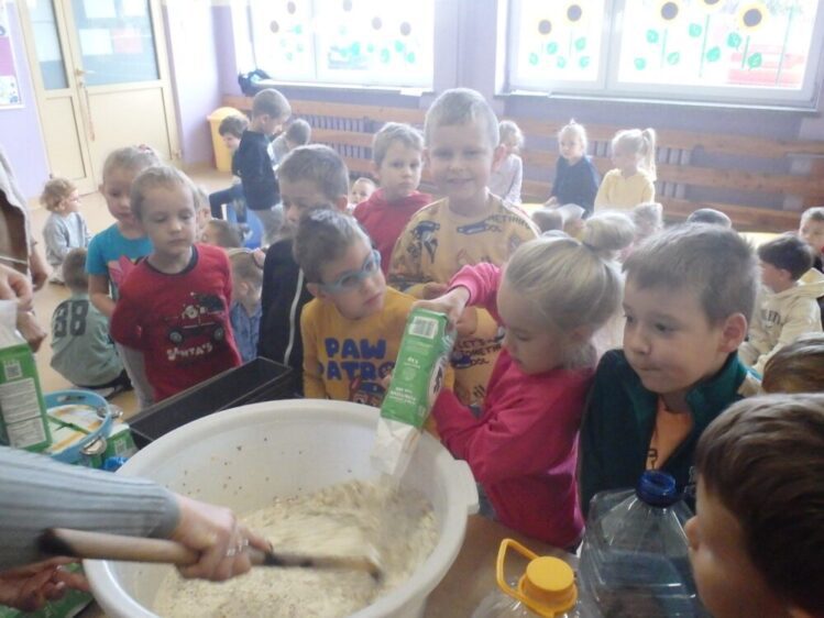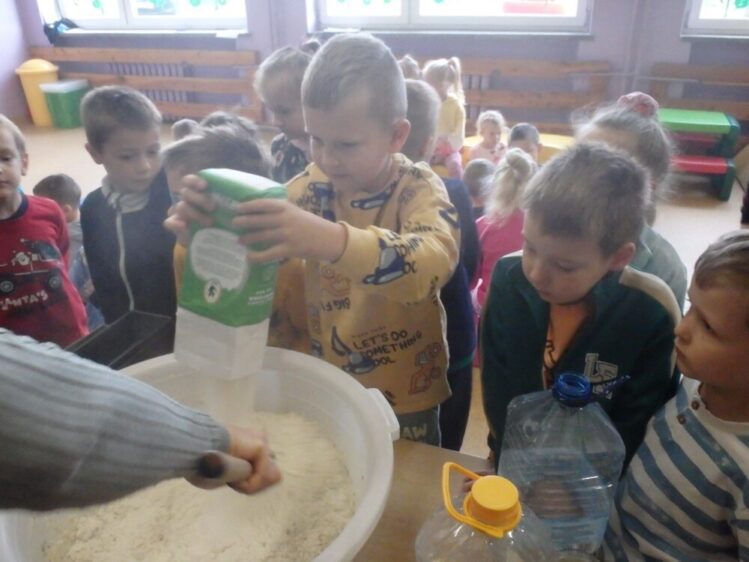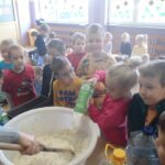Z okazji przypadającego Dnia Chleba w październiku, w naszym przedszkolu odbyło się wspólne pieczenie chleba. Dzieci poznały etapy powstawania chleba. Wszystkie składniki zostały starannie połączone. Po upieczeniu chleba w przedszkolnej kuchni nastąpiła degustacja. Świeży, zdrowy chlebek smakował wspaniale !!!