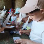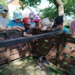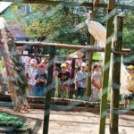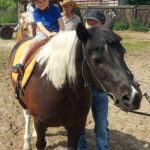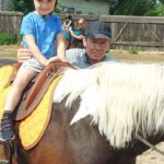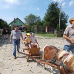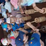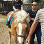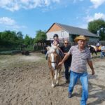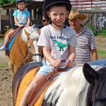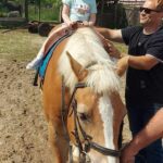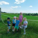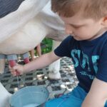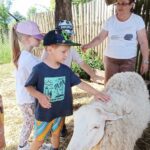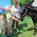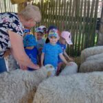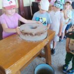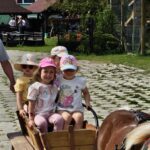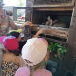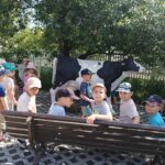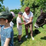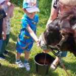 28 maja grupy: Żabki i Pszczółki odwiedziły gospodarstwo agroturystyczne i zagrodę edukacyjną „Ranczo Artemidy” położoną w urokliwej miejscowości Nowa Góra. Przedszkolaki wzięły tam udział w „Żywych lekcjach gospodarskiej tradycji” w czasie których dowiedziały się, jak dawniej wyglądało życie w domu i zagrodzie. Dzieci poznały dawne narzędzia używane do prania, prasowania, szycia, wyrabiania masła, itp. Zwiedziły również stajnię i kurnik. Pszczółki wzięły też udział w warsztatach  „Od gęsiego pióra po długopis”, ale oczywiście największą frajdę sprawił wszystkim kontakt z żywymi zwierzętami. Niektóre przedszkolaki po raz pierwszy w życiu zobaczyły pawia, dotknęły runa owcy, nakarmiły osiołka i króliki. Ciekawym doświadczeniem było też dojenie krowy. Jednak niezaprzeczalnie najbardziej zapamiętana przez dzieci będzie przejażdżka na koniu oraz bryczką.